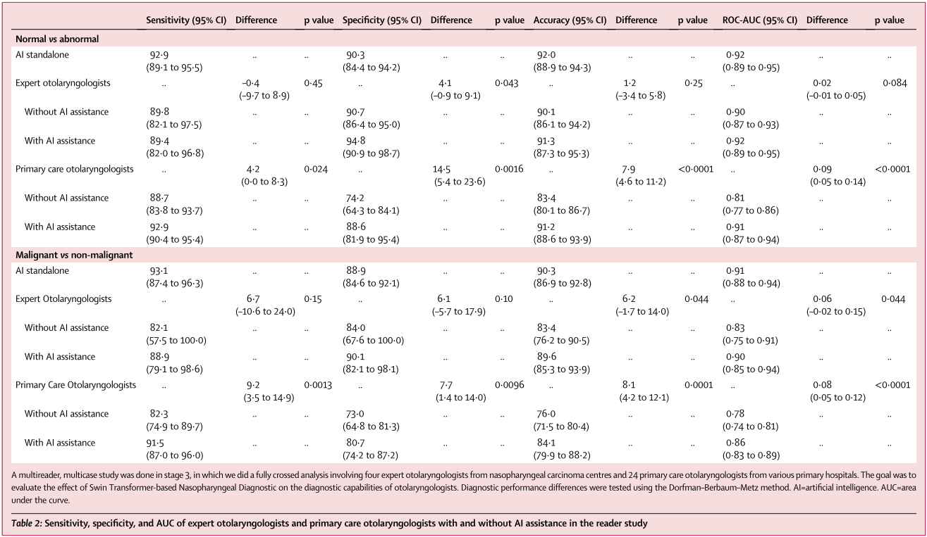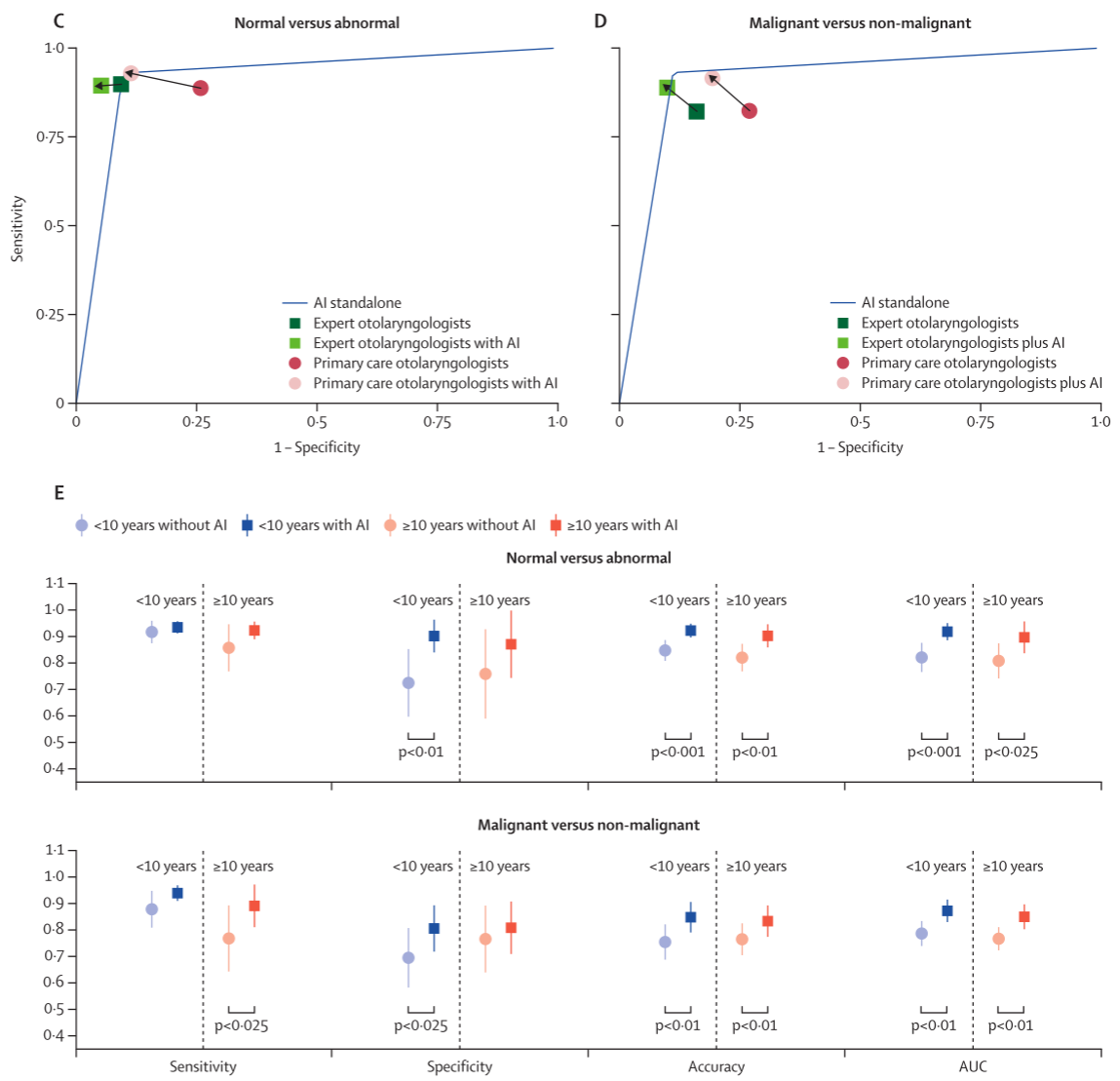 图3 在人机对抗阅片研究中,耳鼻喉科专家和初级保健耳鼻喉科医生在有无AI帮助下的敏感性、特异性、准确率和AUC