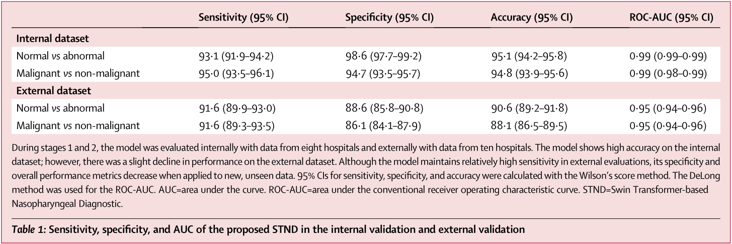 研究人员首先收集了来自8个高容量区域(每年200例鼻咽癌病例)鼻咽癌临床研究中心的27362张鼻咽内镜图像,覆盖了我国东南沿海鼻咽癌常发区域,在此基础上创新性地提出了基于 Swin Transformer 架构的鼻咽癌辅助诊断系统 STND (Swin Transformer-based Nasopharyngeal Diagnostic system),用于精确识别内镜图像中的三种关键组织状态:鼻咽癌、良性增生和正常鼻咽结构,并进行了内部验证。