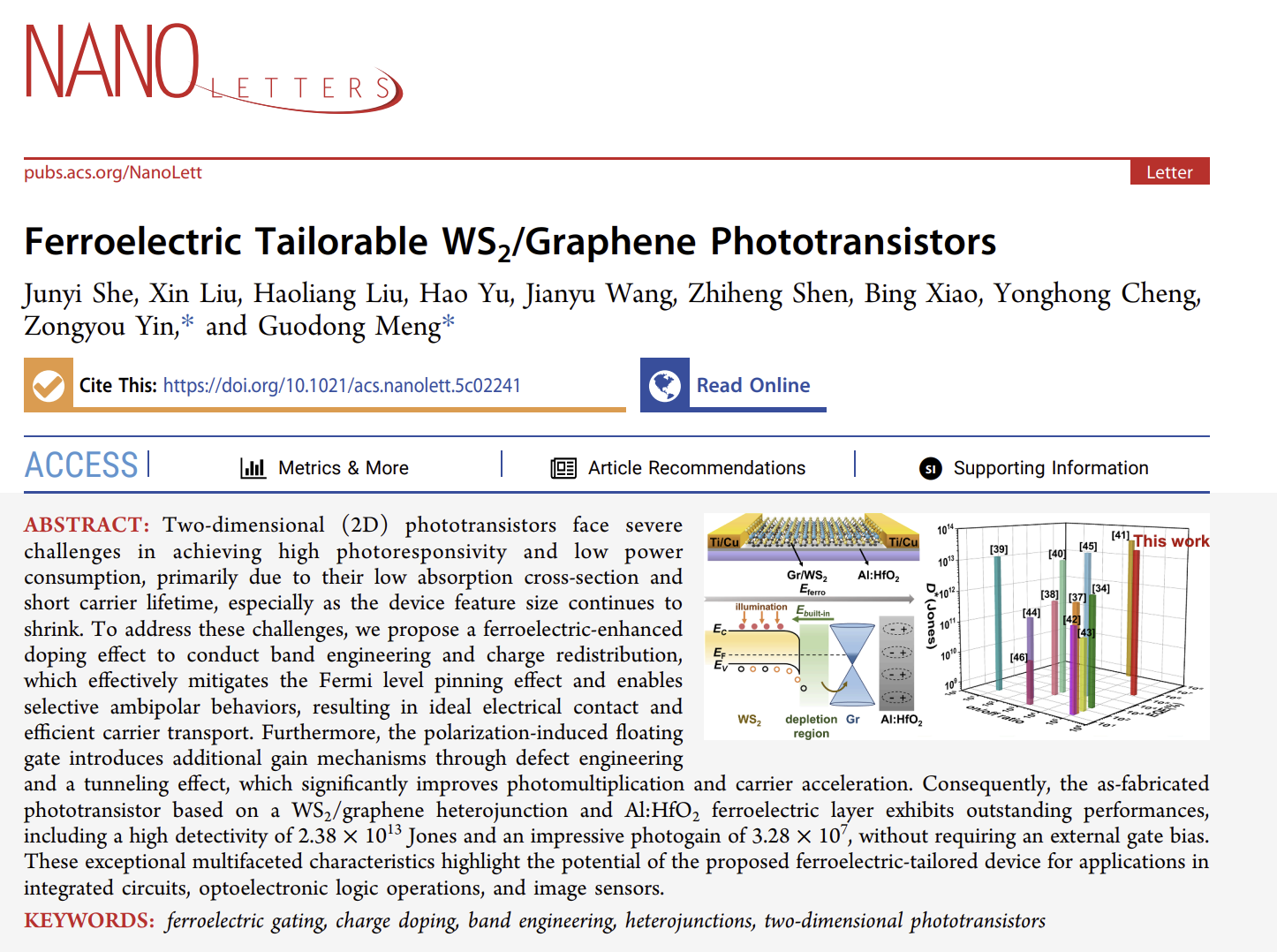 近日,该研究成果以《铁电栅控WS2/石墨烯光电晶体管》(Ferroelectric Tailorable WS2/Graphene Phototransistors)为题在国际知名期刊《纳米快报》(Nano Letters)发表,电气工程学院博士生折俊艺为论文第一作者,电气工程学院孟国栋教授为论文通讯作者,澳大利亚国立大学Zongyou Yin教授为共同通讯作者,西安交通大学为本论文的第一作者单位和通讯单位。本研究工作的顺利开展得到了材料学院高级工程师张朋诚,以及分析测试共享中心任子君主任、李超工程师的大力支持。