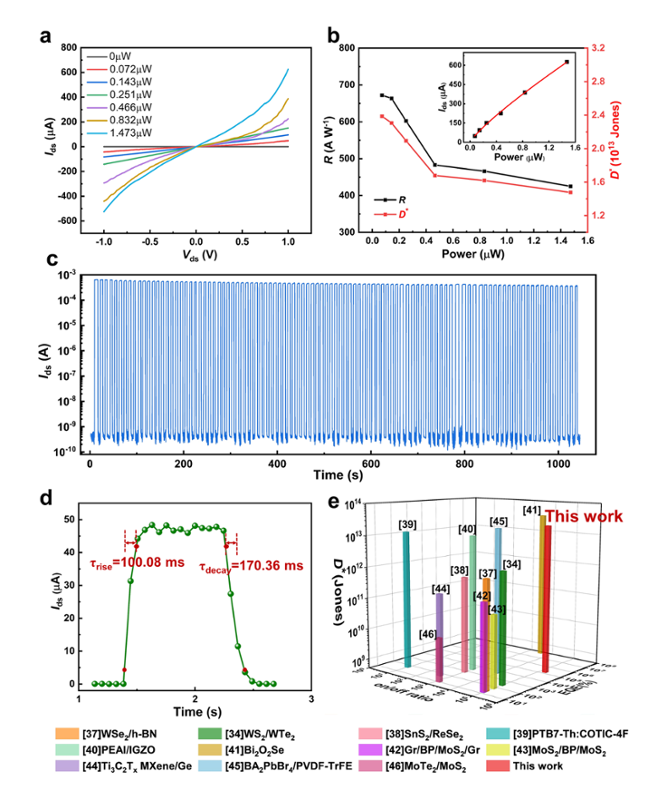 针对上述问题,西安交通大学电气工程学院、电工材料电气绝缘全国重点实验室孟国栋教授团队联合澳大利亚国立大学Zongyou Yin教授团队,以铝掺杂氧化铪(Al:HfO2)纳米铁电薄膜作栅介质层,以WS2/石墨烯二维异质结作沟道,制备出新型高性能铁电栅控场效应光电晶体管。首先,利用铁电浮栅引入的缺陷工程以及局域场增强调控的隧穿效应,既延长光生载流子寿命又抑制载流子渡越时间,有效解决了光栅压器件普遍存在的光增益与响应带宽的权衡问题,显著提高了器件的探测效率和响应速度。进一步,通过调控非易失性剩余极化场实现铁电增强的静电掺杂效应,有效抑制费米能级钉扎,达到肖特基-莫特极限接触,提升载流子迁移效率,实现了晶体管选择性的p-型掺杂和双极性运输。设计完成的铁电栅控二维光电晶体管展现了出色的光电响应性能,在零外施栅压下,器件的比探测率和光增益分别高达2.38×1013Jones和3.28×107,与已报道的二维异质结器件相比,其检测信噪比高、响应迅速、运行功耗低,为实现高灵敏、自取能的电力设备状态监测提供了新方案。