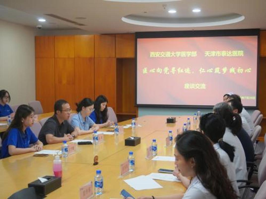 为深入贯彻落实国家关于深化医教协同进一步推进医学教育改革与发展的部署要求,响应新时代医学人才培养的号召,7月26日上午,西安交通大学医学部“仁心红迹,星火传承”暑期社会实践队开展“医心向党寻红迹,仁心筑梦践初心”主题系列实践活动。实践活动首站走进天津市泰达医院,开展了一场兼具深度与温度的参观学习与座谈交流。西安交大医学部党委副书记陈晨,泰达街工委副书记、主任张明、泰达医院党委副书记、院长王一旻、院党委委员、医务部主任张睿及院方相关负责人参与此次活动。