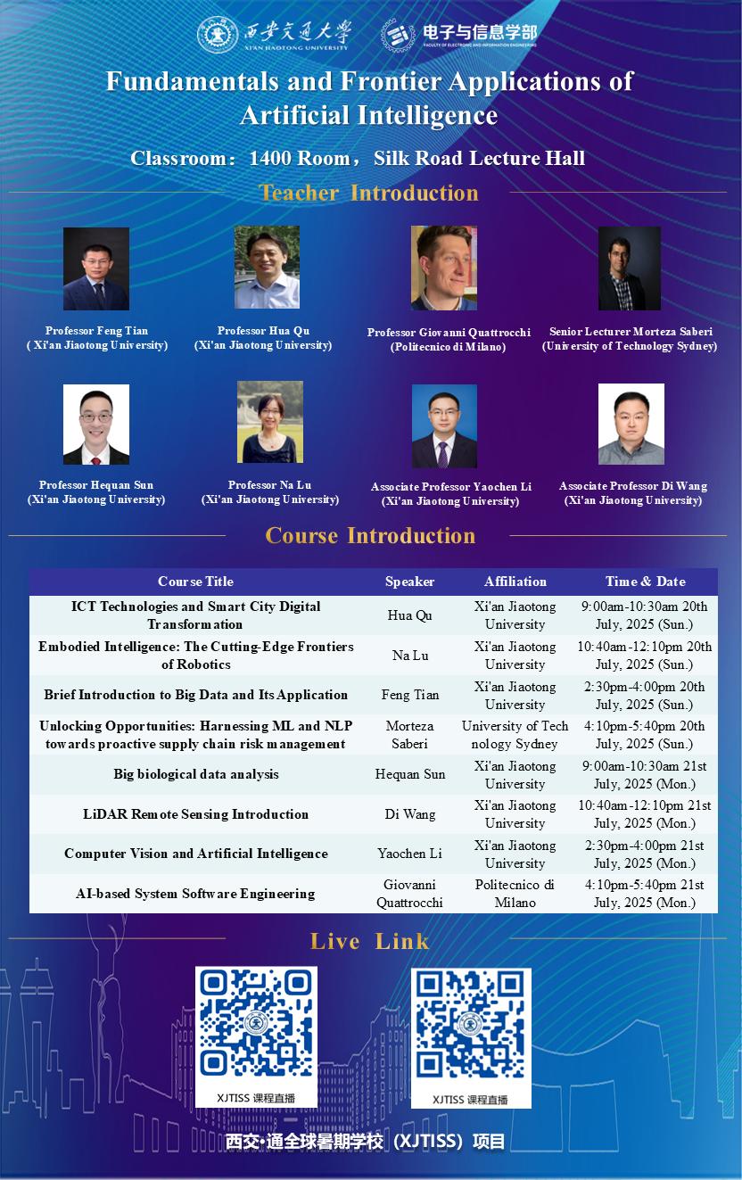 本次系列讲座以“人工智能基础与前沿应用”为主线,邀请了八位学者进行授课,西安交大电信学部副主任田锋教授、自动化学院副院长吕娜教授、自动化学院孙贺全教授、软件学院曲桦教授、软件学院院长助理李垚辰副教授、软件学院王迪副教授,以及米兰理工大学Giovanni Quattrocchi教授、悉尼科技大学Morteza Saberi高级讲师。讲座内容既涵盖了人工智能核心原理与通用技术框架,延伸至智慧城市、生命健康、计算机视觉、空间遥感、供应链管理等前沿交叉场景。每场讲座完成后均设置线上测试,帮助700余名本科生即时检验学习成效。在两天的高密度、全英文的交流中完成跨文化、跨学科的知识更新与思维共振。西安交大丝路新影工作室刘峰老师团队为课程的全球直播提供了技术保障和平台支持,为跨国界、跨时区的学术传播奠定了坚实基础。