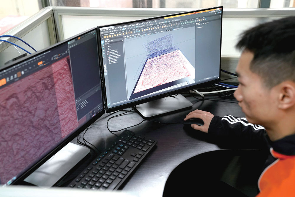 工作人员在计算机虚拟环境下对中国石窟中唯一等身高的《帝后礼佛图》浮雕残壁进行数字处理(李安/摄)