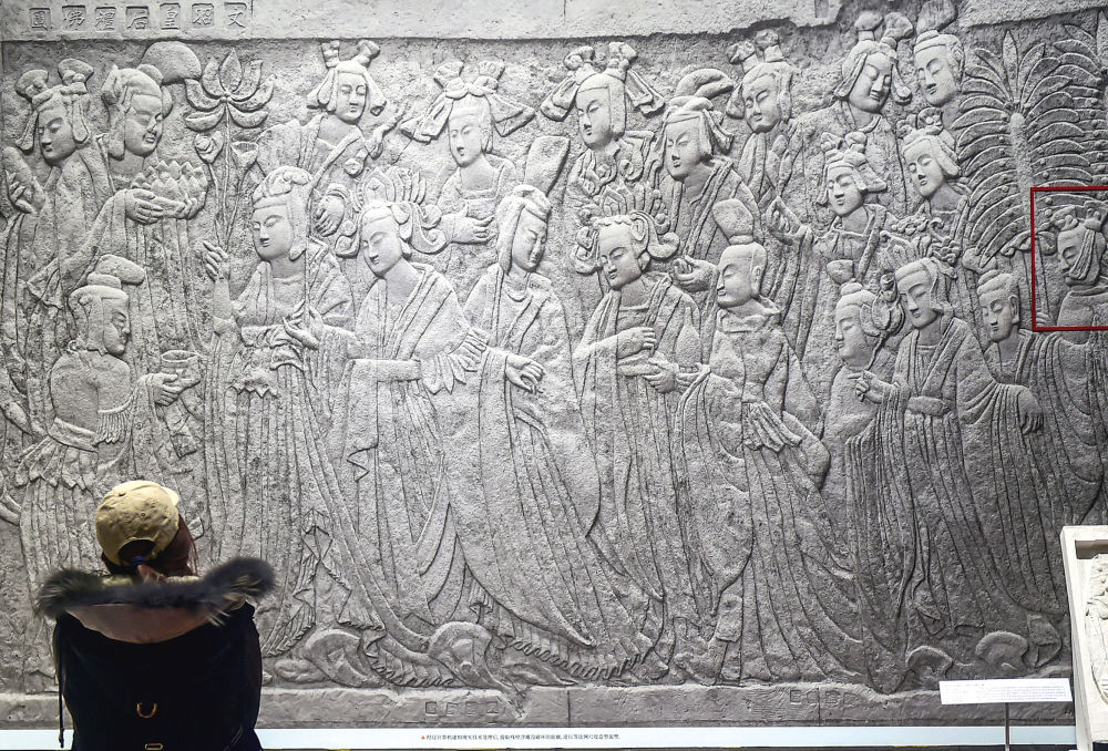 展馆中心,一幅按原比例数字化虚拟逆向造型复原的《文昭皇后礼佛图》浮雕蔚为壮观。作为《帝后礼佛图》的一部分,其3.13米长、2.36米宽的尺寸,足以佐证当年龙门石窟宾阳中洞开凿时的宏伟。
