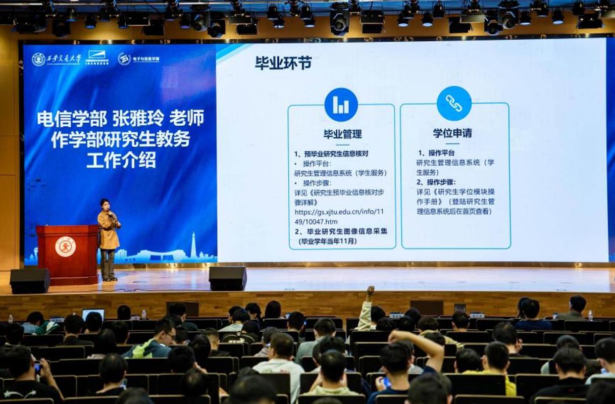 莘莘学子至,扬帆正当时。9月19日晚,电信学部2025级研究生新生入学教育大会在创新港千人报告厅举行。就业与创业指导中心副主任沈人杰,保卫处党总支委员常帅,电信学部副主任李永东、党委副书记史锋、综合行政文员张烨、硕士研究生教务员张雅玲、团委书记罗曼、硕博研究生辅导员魏远、南亚娟、孙玮辰,电信学部2025级全体硕博新生参加,会议由电信学部团委副书记余恩得主持。