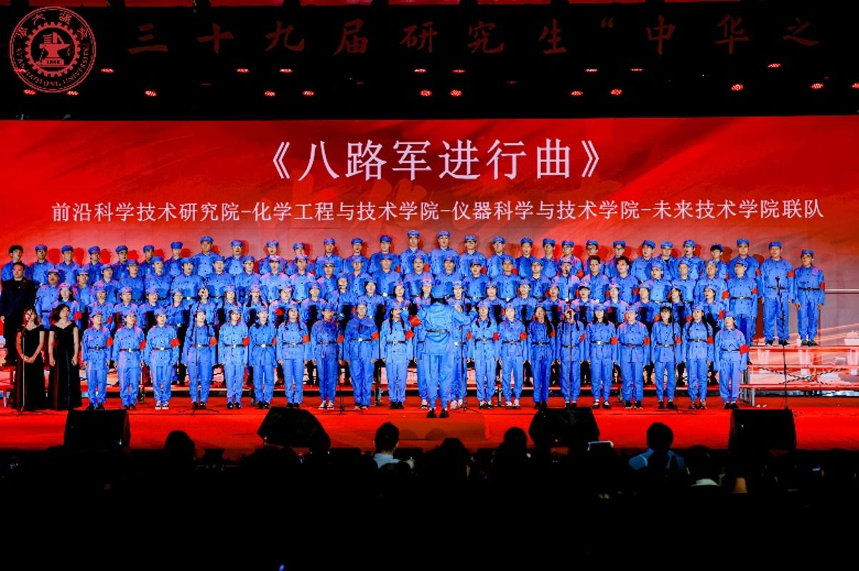 第二篇章“砥柱中流·民族的脊梁”展现了中华民族在危难时刻的坚韧与担当。经济与金融学院-人工智能学院-国家储能技术产教融合创新平台(中心)联队带来的《飞跃大渡河》气势磅礴,以江河奔腾的力量感,再现了红军战士强渡天险的英雄气概。航天航空学院-新闻与新媒体学院-人文社会科学学院-法学院联队演唱的《唱支山歌给党听》深情舒缓,温暖而厚重,如同儿女对母亲的深情倾诉。电子与信息学部选择的《爱永在》旋律优美流畅,歌声深情坚定,展现了电信学子科技报国的家国情怀。前沿科学技术研究院-化学工程与技术学院-仪器科学与技术学院-未来技术学院联队以《八路军进行曲》展现了强大的凝聚力,铿锵有力的演唱充分展现了科技工作者们纪律严明、勇往直前的精神风貌。