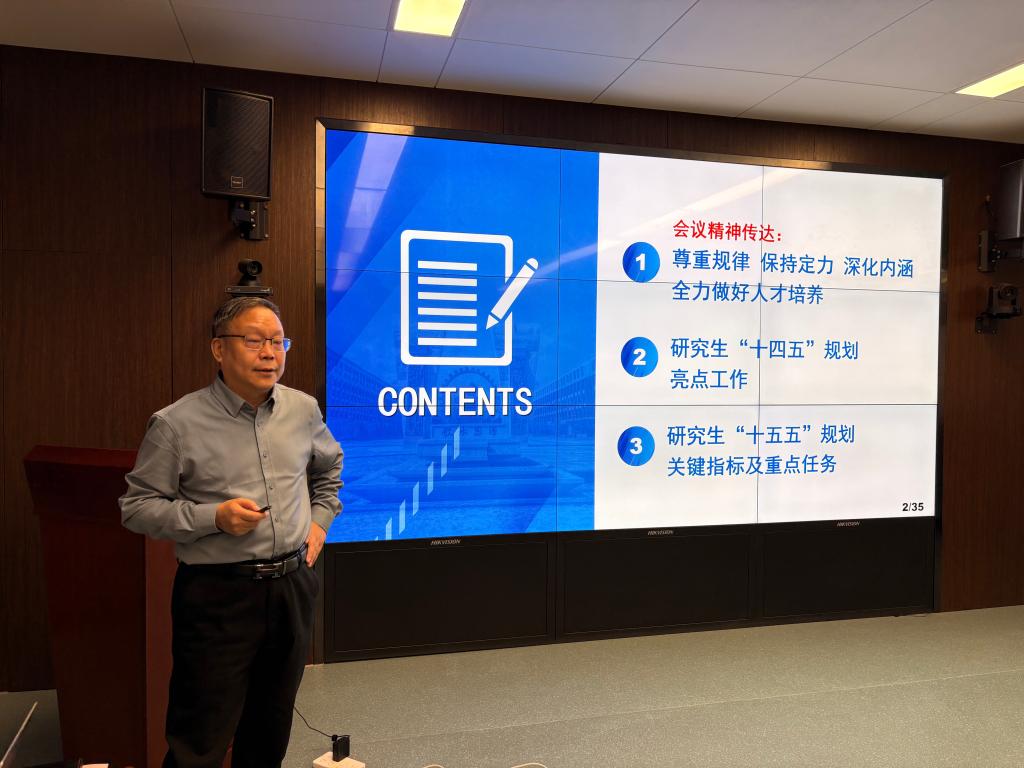 何茂刚传达了学校领导班子工作务虚会上关于“构建高质量人才自主培养体系”专题报告的有关精神,并通报了研究生教育“十四五”总结及“十五五”规划相关情况。他指出,“十四五”期间,研究生院以习近平总书记关于教育、科技、人才的重要讲话精神和全国研究生教育会议精神为指导,坚持“四个服务”,围绕学校研究生教育“十四五”规划目标任务,在研究生招生、培养、学位授予与质量保障、学籍管理与思政教育等方面开展一系列改革与探索,圆满完成了规划目标任务。全校研究生教育工作在新增学位点、招生规模扩大、精品课程和教材建设、竞赛获奖增长、五育并举全覆盖等方面亮点突出,初步建成学科前沿探索牵引、产教融合攻关牵引、学科方向交叉牵引的高层次人才自主培养体系。何茂刚向与会人员详细解读了“十五五”及“十六五”规划全校研究生工作关键指标预期目标,强调要紧扣国家战略需求,结合学校办学定位与特色,参考国内顶尖高校经验,扎实落实重点任务和工作目标。