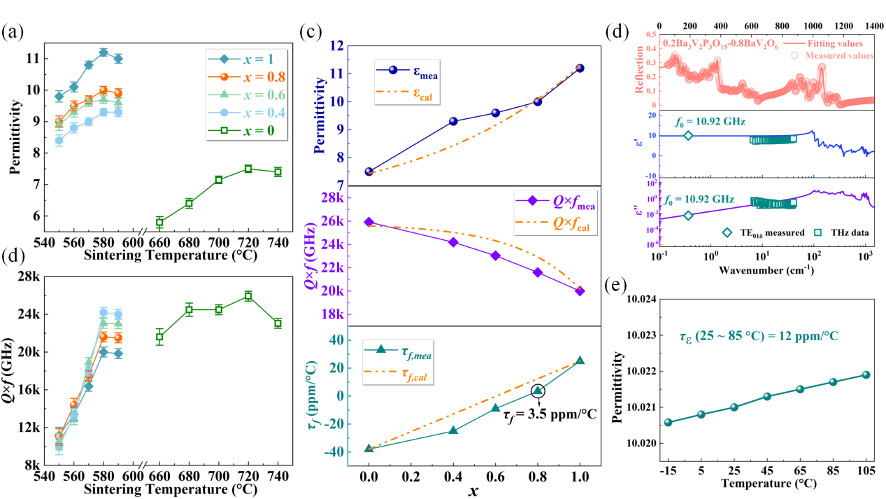 图4. (a) (1-x)Ba3V2P3O15-xBaV2O6(0 ≤ x ≤ 1)陶瓷的介电常数、(b) Q×f值随烧结温度变化的关系;(c) 微波介电性能随x值变化的实测与计算结果;(d) 0.2Ba3V2P3O15-0.8BaV2O6陶瓷的实测与拟合红外反射光谱;(e) 0.2Ba3V2P3O15-0.8BaV2O6陶瓷在微波频率范围内,介电常数随温度的变化关系。(温度范围:−15~105 ℃)