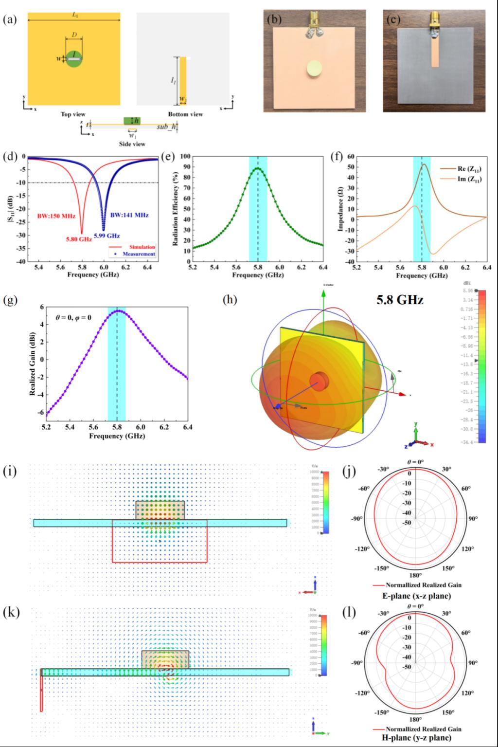图5. DRA单元:(a) 设计结构、(b)(c) 实际制备结构;(d) 反射系数|S11|幅值仿真与实测结果;(e) 辐射效率、(f) 输入阻抗、(g) 实际增益;(h) 在5.8 GHz下的三维方向图;(i) x-z平面、(k) y-z平面内电场分布的仿真结果;(j) E面、(l) H面辐射方向图的仿真结果。