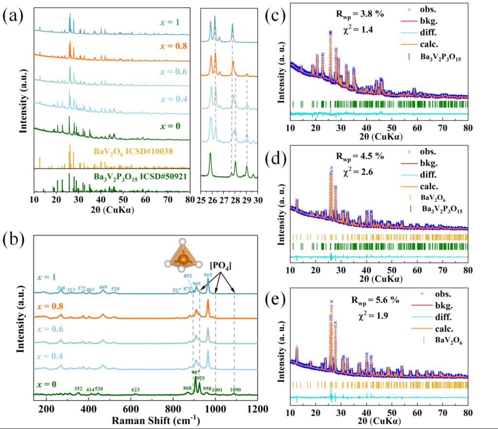 图1. (a) (1-x)Ba3V2P3O15-xBaV2O6(0 ≤ x ≤ 1)陶瓷样品在各自最佳烧结温度下烧结后的XRD图谱;(b) 上述陶瓷样品的拉曼散射光谱;(1-x)Ba3V2P3O15-xBaV2O6陶瓷样品在各自最佳烧结温度下烧结后的Rietveld精修图谱:(c) x = 0;(d) x = 0.8;(e) x = 1