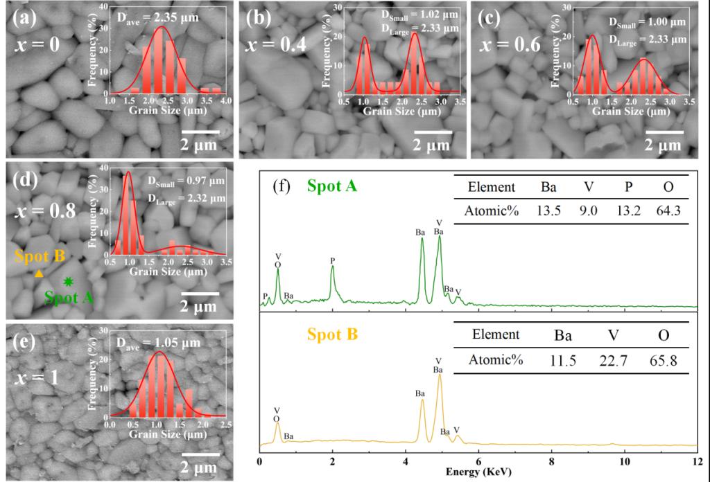 图3. (1-x)Ba3V2P3O15-xBaV2O6复合陶瓷在最佳温度下烧结后的SEM图像及对应的晶粒尺寸分布:(a) x = 0;(b) x = 0.4;(c) x = 0.6;(d) x = 0.8;(e) x = 1;(f) (1-x)Ba3V2P3O15-xBaV2O6陶瓷的EDS谱图。(其中Dave代表单相陶瓷的平均晶粒尺寸,DLarge和DSmall分别代表复合陶瓷中两种不同晶粒类型的平均晶粒尺寸)