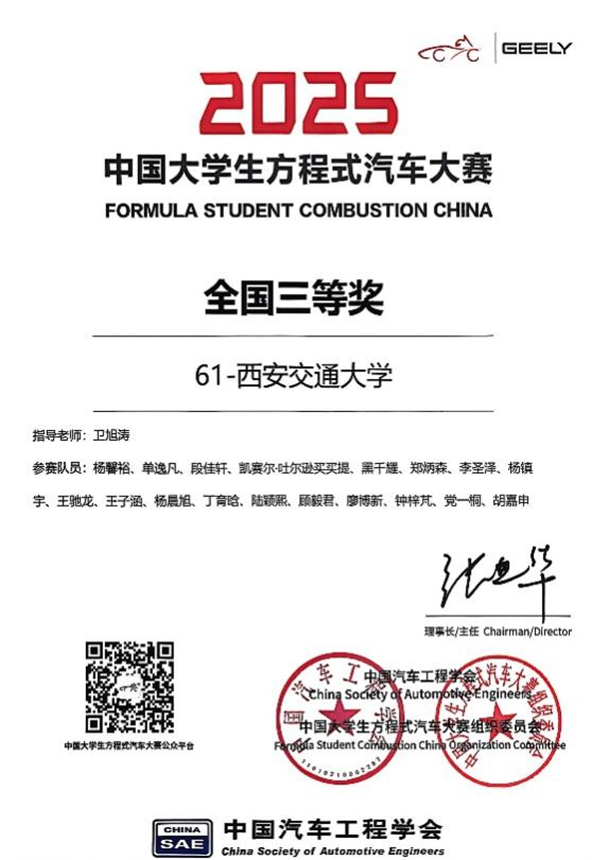 近日,第16届中国大学生方程式汽车大赛在河南郑州圆满落幕。历经五天激烈角逐,西安交通大学毅行方程式车队(XJRT)斩获全国三等奖,彰显了交大学子在汽车工程实践领域的扎实功底与卓越实力。