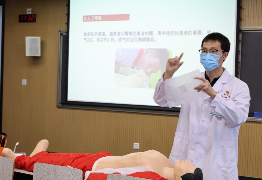 江啸聚焦“黄金4分钟”生命救援,重点讲解自动体外除颤器(AED)使用方法、心肺复苏(CPR)操作流程及正确要领。理论讲解过程中,他借助教学器材进行现场操作演示,逐一步骤分解动作细节,将抽象的急救知识转化为直观可感的实操内容。在场新生全神贯注学习,纷纷表示通过讲座不仅掌握了实用的急救理论,更清晰明确了紧急情况下实施初步救援的正确思路与方法。