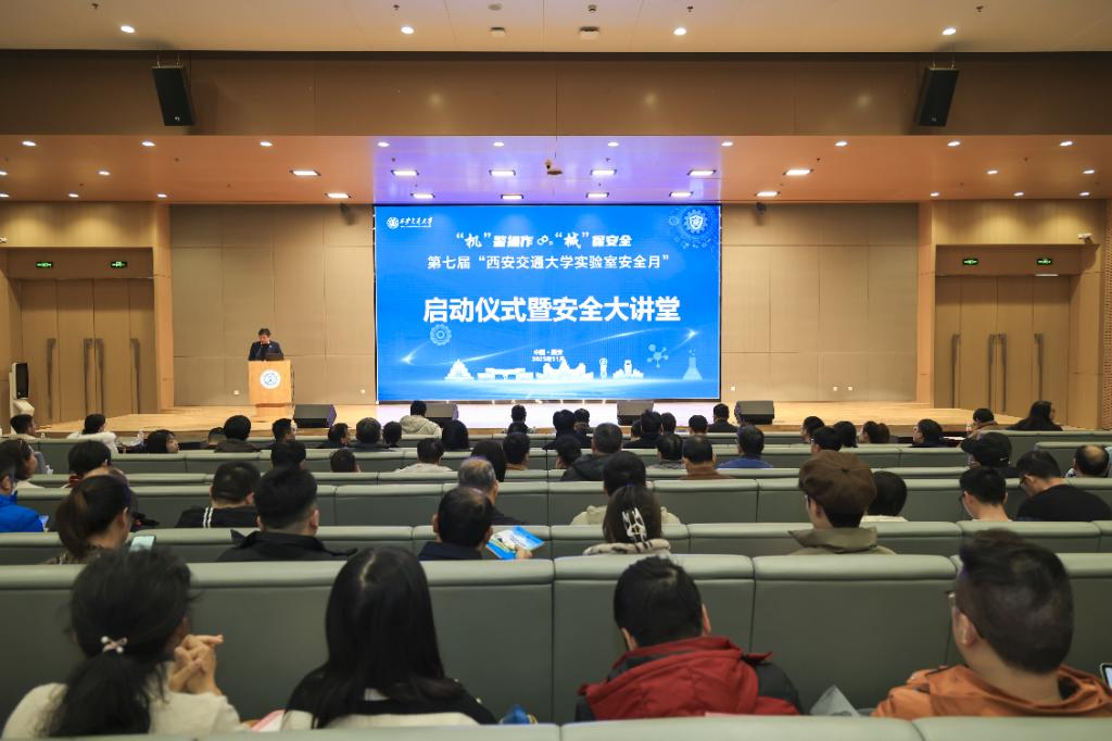 11月19日,以“‘机’警操作,‘械’保安全”为主题的西安交通大学第七届“实验室安全月”活动启动仪式暨实验室安全大讲堂在中国西部科技创新港涵英楼新港报告厅举行。本次活动由实验室管理处主办、机械工程学院承办,西安交通大学党委常委、常务副校长别朝红出席并致辞,各相关职能部门领导、实验室安全督查组专家、二级单位实验室安全责任领导、各级安全员、实验室安全网格员、师生代表近300人参会。启动仪式由机械工程学院党委书记张俊斌主持,通过线下会议与线上直播同步开展,线上近7000人次观看直播。