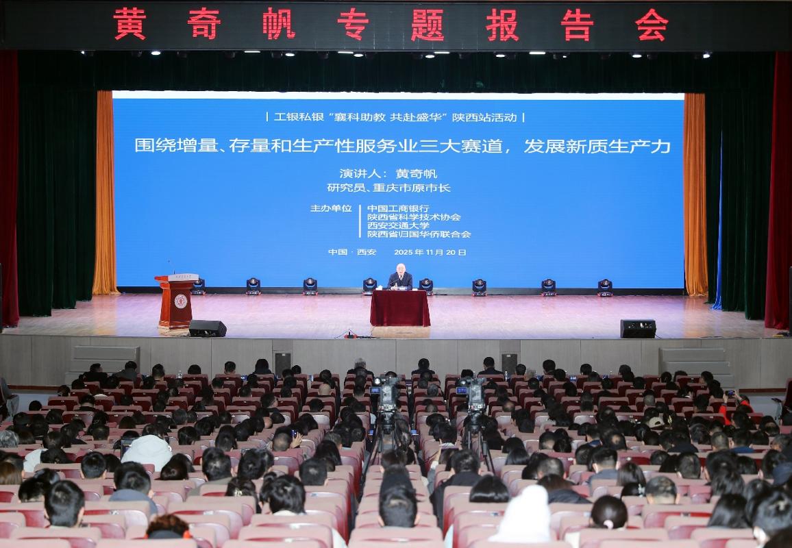 11月20日,中国金融40人论坛学术顾问、国家创新与发展战略研究会学术委员会常务副主席、重庆市原市长黄奇帆受邀来到西安交通大学,在宪梓堂为师生带来《围绕增量、存量和生产性服务业三大赛道,发展新质生产力》的专题报告。西安交通大学党委书记卢建军会见黄奇帆一行。陕西省科协副主席吕建军,陕西省侨联副主席尚小红,中国工商银行总行私人银行部副总经理辛峰、陕西分行副行长李莉,西安交通大学党委副书记孙早,党委常委、宣传部部长、统战部部长成进参加有关活动。西安交通大学党委副书记马博虎主持报告会。