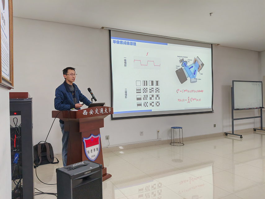 单像素成像与透过复杂介质成像是当前光学成像领域的重要前沿方向,具有极高的学术研究与工程应用价值。讲座中,刘瑞丰副教授以“黑洞的照片是如何拍摄的”这一一问题为切入点,从光学成像的基本概念、单像素成像、透过复杂介质成像、量子成像以及技术总结与展望等多个维度展开阐述。在介绍单像素成像、透过散射介质成像等颠覆性技术时,他巧妙地揭示了“计算”如何赋予光学新的生命力,化腐朽为神奇,实现“一个像素成像”乃至“拨开迷雾见真章”的奇妙过程。当讲解到最具神秘色彩的量子成像时,通过生动的比喻和简明的原理图,将这一高深领域描绘得直观而富有趣味,引起了同学们的浓厚兴趣。