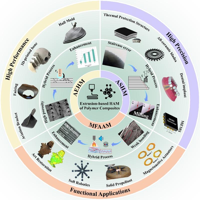研究团队系统梳理了增材复合制造过程中材料流变、链段扩散、孔隙演化及界面重构等核心机理,建立了混合工艺选择与性能提升之间的内在关联,形成了一张面向工程应用的“工艺地图”。相关分析表明,合理设计混合制造路径,可在不牺牲成形自由度的前提下,实现聚合物构件几何精度、致密度和力学性能的同步提升。研究工作为聚合物增材复合制造从“可制造”走向“可工程应用”提供了系统化理论支撑,也为高性能结构与多功能器件的混合制造设计奠定了基础。
