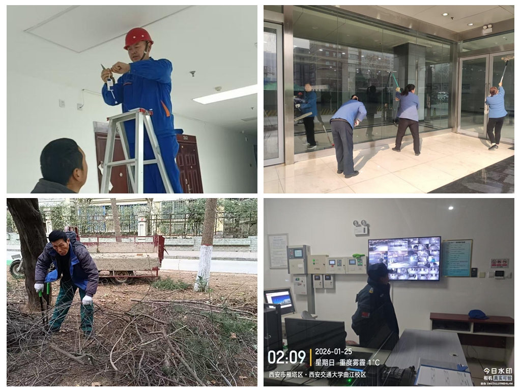 曲江校区管理办公室严格落实学校寒假工作部署要求,全面启动假期服务保障机制,做好安全巡查排查、设施设备巡检、环境整治、应急值守部署、冬季植被绿化养护等重点工作,确保校内各类设施设备运行正常,校区运行平稳有序。筑牢安全防控体系,守好校园第一道防线:出入管理规范化,严格执行门岗24小时值守制度;全域巡查无死角,采用定点值守与动态巡逻相结合模式联防联治;消防设施全检测,配合消防维保单位对校区消防系统开展排查。检修设施设备,保障运行稳定:加大校区水电暖设施巡检力度,每天定时对配电室、水泵房、锅炉房等重点部位进行巡查,及时发现并处理各类故障隐患; 应急保障提前部署,完善雨雪、寒流天气预案,确保应急物资充足到位。推进环境整治,营造洁净校园氛围:冲洗门厅、地垫,对公共区域死角做好清洁,保持校园环境整洁。服务留校师生,全力暖心护航:快速响应师生咨询、报修等事项;生活服务有保障:供暖、浴室、开水正常运行,购电充值正常进行。绿化养护工作,清理景园和西二楼北花园道路积雪,清理绿化区落叶,整形修剪西五楼北侧树木,保持区域整洁美观。