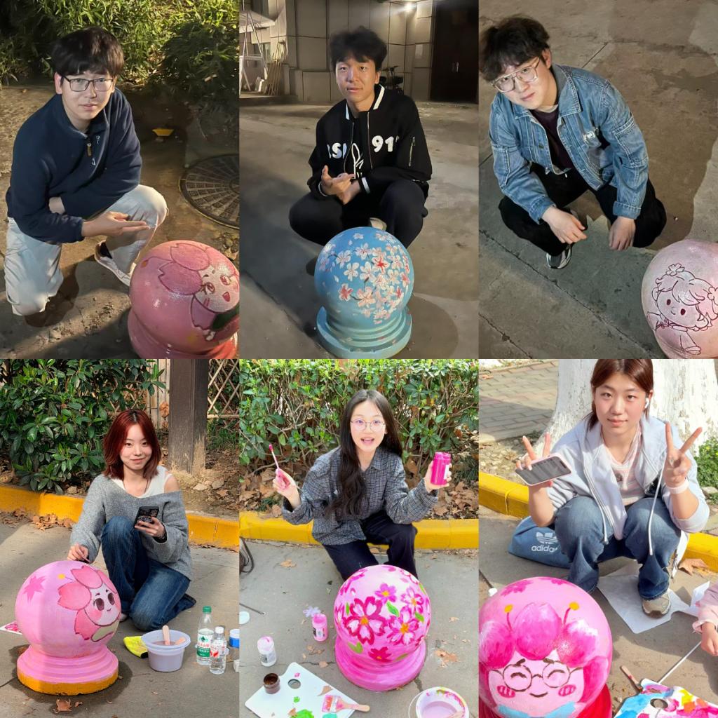 活动前期,同学们集思广益,结合樱花节主题与校园文化特色,精心构思设计方案,将樱花元素融入创作之中。保卫处积极配合,提前清理石墩表面,并梳理数量、位置等信息,为活动开展做好准备。活动现场,同学们分工协作,从起稿、调色到上色、精修,每一笔都倾注着对学校的热爱与对校庆的祝福。画笔下的樱花或含苞待放、生动可爱,或肆意盛放、绚烂多姿,一笔一画间,春日灵动与青春创意一一定格。绘制完毕后,保卫处队员与同学们协作对石墩进行了后续防水保护。