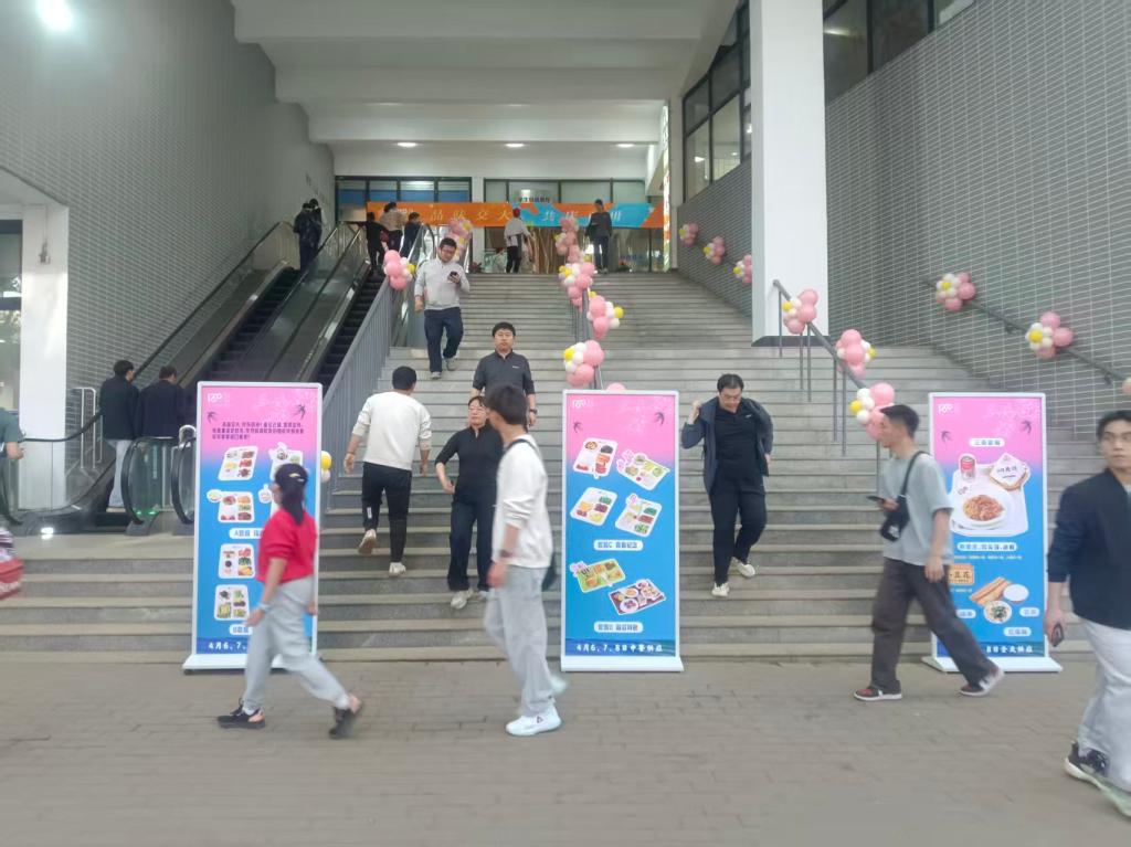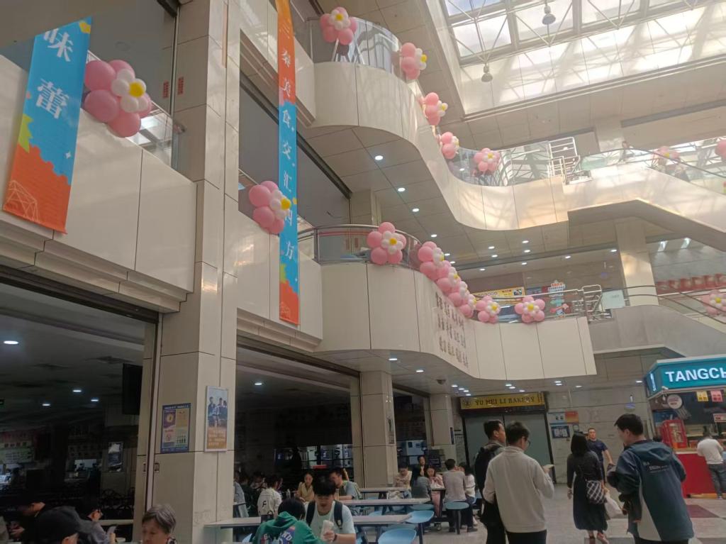 校庆供餐作为大型团体活动,确保食品安全是重中之重。2026年春季食品安全培训会上,中心负责人专门针对供餐提出了最严格的要求。校庆期间,中心全程严守食品安全底线,严格落实食材索证索票、溯源管控、餐具消杀、菜品留样等规范流程,从食材采购、加工制作到分餐供餐,每个环节专人负责、全程监管,确保供餐安全、可口。4月6日至8日,中心全员坚守岗位、高效协同,有序完成校友返校大会、校庆大会的供(配)餐任务,并出动流动餐车在校园中提供临时服务。为营造温馨、喜庆的用餐环境,中心除在各食堂门口摆放就餐温馨提示,悬挂欢迎横幅,还在食堂里面张贴校庆海报、扎制樱花装饰和制作校庆宣传墙。食堂新投入使用有交大和校庆专属LOGO的餐盘3000套,使就餐的校友和师生们爱不释手。