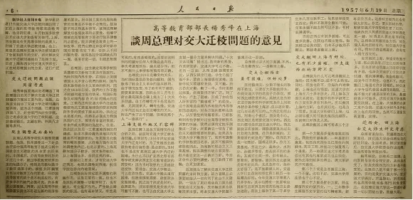 1957年6月19日,《人民日报》刊登杨秀峰谈周总理对迁校问题的意见