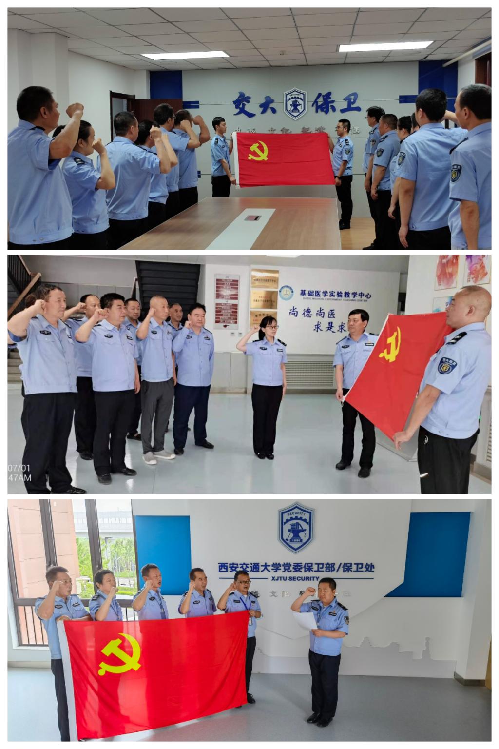庆祝中国共产党成立100周年大会直播结束后,保卫处各支部党员同志分别在兴庆、雁塔校区和创新港举行了“庆祝建党百年,重温入党誓词”活动,通过重温入党誓词的方式,牢记党员初心使命,向党的百年华诞献礼。