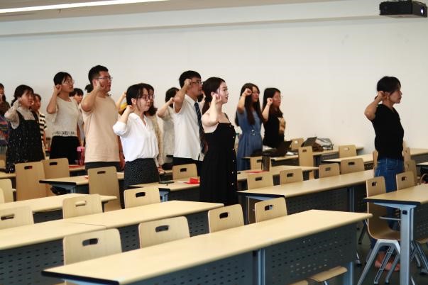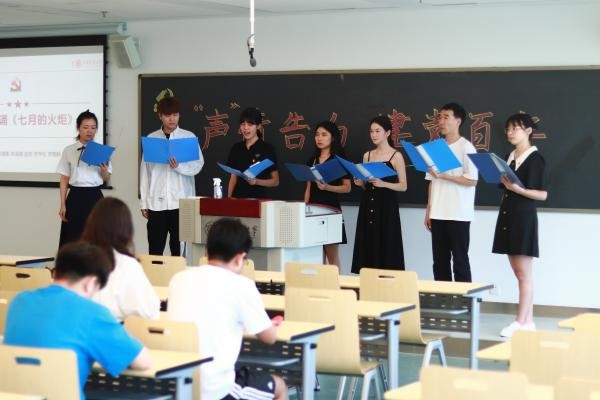 公共卫生学院研一学生支部委员李香闺、方雅蕾、党宇松、赵妍、张瑾、李雅静、朱海璐以诗歌朗诵《七月的火炬》献礼党的百年华诞。“您率领中国人民度过了一次次艰难险阻,您以非凡的魄力屹立成东方不落的太阳。”气势磅礴的朗诵词铿锵有力,现场气氛热烈,同学们热情高涨。紧接由党员王璇、积极分子沈智然领唱,参会人员合唱《我和我的祖国》,全体学生挥舞国旗,共同祝愿祖国繁荣富强。最后,全体起立,由岳甜领誓,党员重温入党誓词,铿锵有力的宣誓声响彻教室。