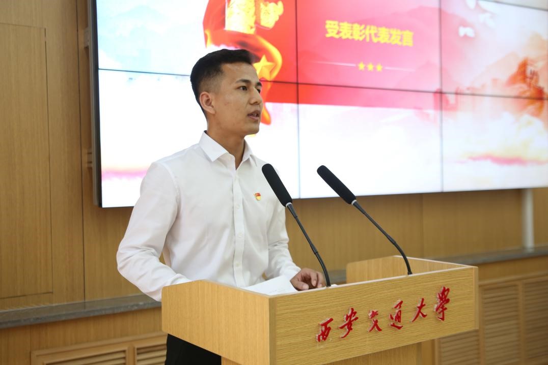 优秀共产党员代表、南洋书院党总支副书记马凯,即将毕业奔赴西藏拉萨支教,他感谢组织和学校的培养,发言中动情地谈到,作为一名青年党员,最重要的是要有家国天下的情怀和为理想不懈奋斗的一腔热血,始终坚定信念、脚踏实地、砥砺前行。他表示要牢记习近平总书记的嘱托,以实现中华民族伟大复兴为己任,增强一名西迁新传人的时代使命感,做民族之脊梁,国家之希望。