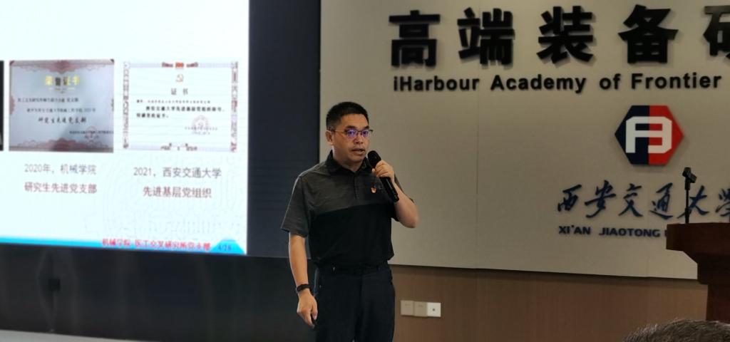 教职工优秀党员、创新港青年先锋代表黄军辉进行发言。他汇报了新能源装备与质量工程研究所的前期建设,表示要一切以集体利益为重。学院将传承西迁精神,为学校“双一流”建设以及机械学科的发展贡献力量。