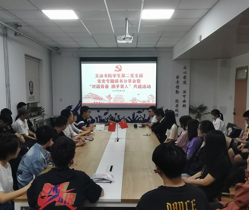 6月20日,文治书院学生第二党支部举办党史主题读书分享会暨“对话青春,携手育人”共建活动,鼓励支部同学读原著、学原文、悟原理,支部特邀请支部指导老师刘翔、张雨分别分享《如何研究中共党史》和《入党——40个人的信仰选择》。