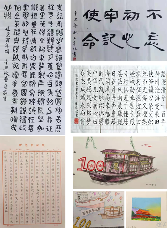 本届书画大赛面向全校学子征集书画作品,历时1个多月,要求参赛者围绕主题自由选择内容形成作品,分为硬笔组、软笔组、绘画组三个比赛组别。比赛通过线下宣传与线上微信推送两种途径收到数十幅硬笔、软笔与绘画作品。作品中有书写“不忘初心、牢记使命”遒劲有力的隶书,有歌颂建党伟业的篆书,有书写爱国诗词的娟秀小楷,也有绘画红船、天安门彰显爱国情怀的绘画作品。