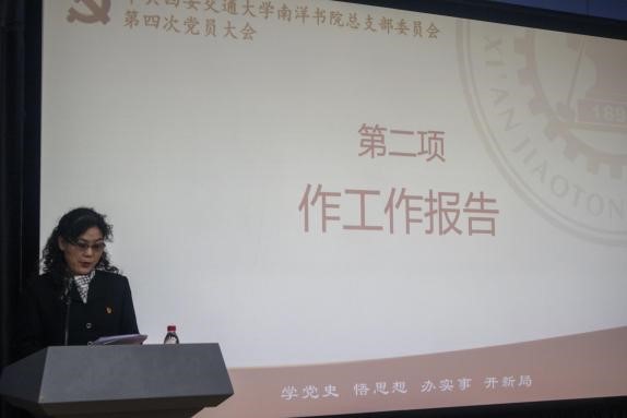 由郭小平代表第三届党总支委员会作题为《落实立德树人根本任务,培育担当民族复兴大任的西迁新传人》的工作报告。报告总结了一年来南洋书院第三届党总支委员会在校党委和大学生党委的坚强有力领导下取得的工作成效。报告指出,第三届党总支委员会以习近平新时代中国特色社会主义思想为指导,开展“不忘初心、牢记使命”主题教育、党史学习教育,认真落实立德树人根本任务;通过进行学生党支部架构改革,加强学院书院协同育人,加强基层党组织建设,发挥党员示范作用,以党建带团建,培育合格的社会主义建设者和接班人;坚持围绕学生、关照学生、服务学生,关注学生身心健康,传扬西迁精神,培养德、智、体、美、劳全面发展的西迁新传人。