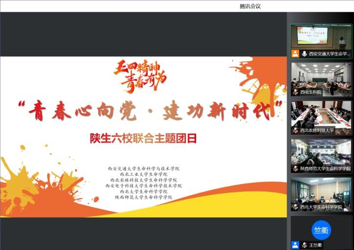 4月29日,西安交通大学生命学院联合西北农林科技大学生命学院、西北工业大学生命学院、西安电子科技大学生命学院、西北大学生命学院、陕西师范大学生命学院共同开展“青春心向党,建功新时代”主题团日。六校生命学院学生工作教师代表、团支部书记、团员参加,西安交通大学生命学院团工委副书记田宇欣主持。