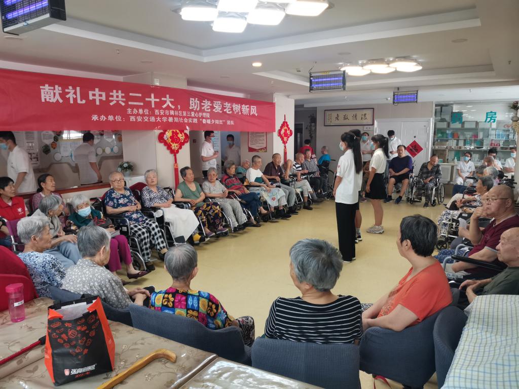 8月1日,在第95个“八一”建军节之际,西安交通大学暑期社会实践“春暖夕阳红”团队联合西安市碑林区第三爱心护理院开展“献礼中共二十大,助老爱老树新风”主题活动,并对碑林区第三爱心护理院的设施管理和服务体系展开调研。