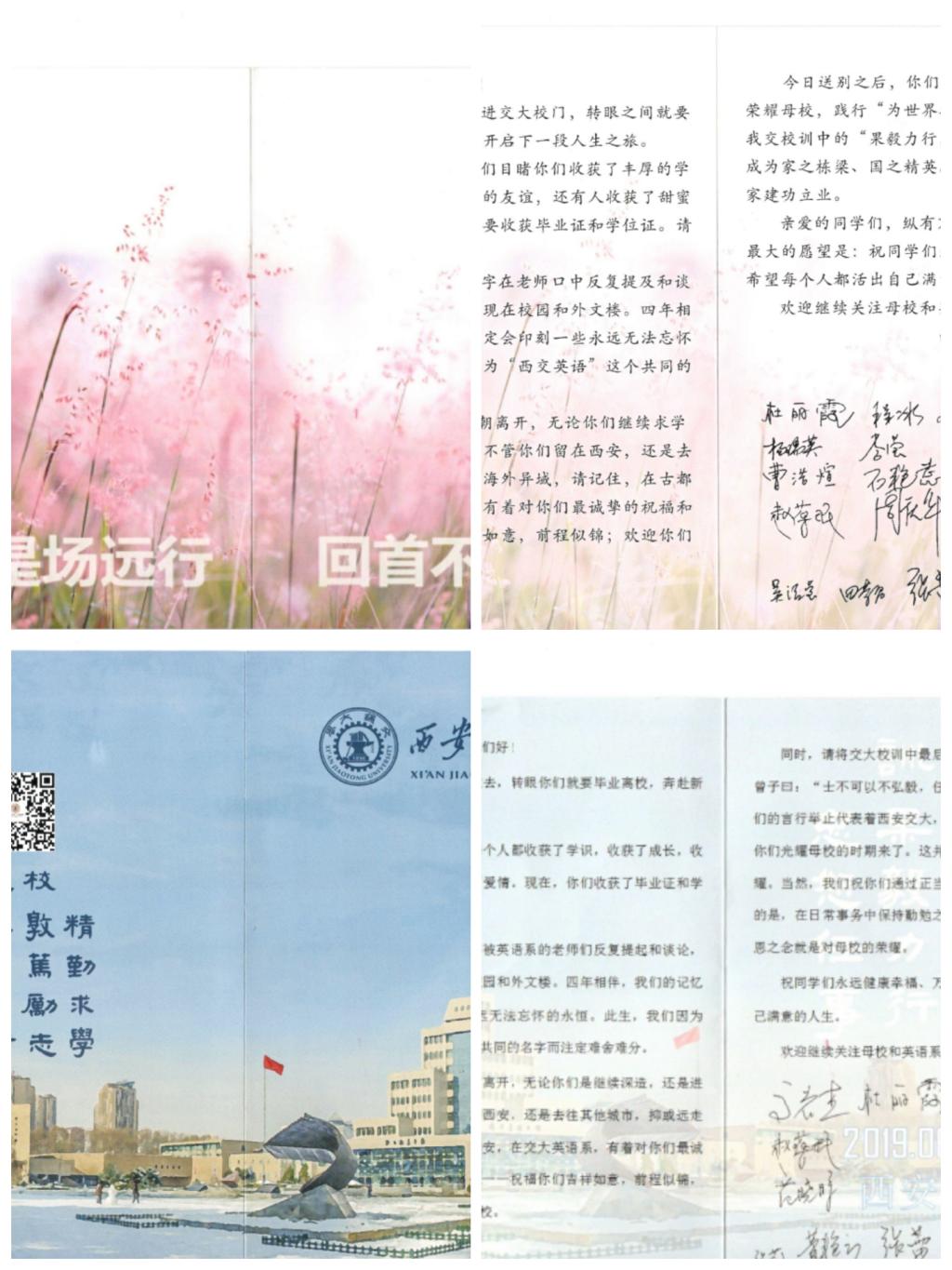 扩展课外链条,全方位协同育人。英语专业深入挖掘各类思想政治教育资源,在课程之外的思政建设也进行得细致扎实。英语系支部书记兼副系主任曹浩煊老师连续数年利用小学期带领大二同学参观西安八路军办事处纪念馆,在帮助学生提高英汉翻译水平和实践能力的同时,使大家深刻了解中国共产党光荣奋斗的抗战历史。英语系党支部利用专业优势,于2021年初制作了两集英语微党课“红色经典:红星照耀中国”及“红色经典:新西行漫记”,并组织全院师生观看学习。英语专业在学业导师指导工作和班主任管理工作中也一直强调贯彻思政育人理念,全方位协同育人,并连续数年为毕业生制作带有临别赠言的贺卡,鼓励学生们走出校门以后继续发扬西安交通大学“为世界之光”的理念等。
