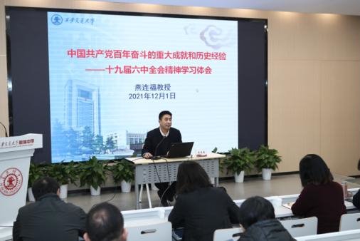燕连福围绕党的百年奋斗重大成就和历史经验的重大意义,党的百年奋斗的初心使命和重大成就,中国特色社会主义新时代的历史性成就和历史性变革,党的百年奋斗的历史意义和历史经验,以史为鉴、开创未来的重要要求等方面,结合实例对党的十九届六中全会精神进行了系统阐述和深入解读。
