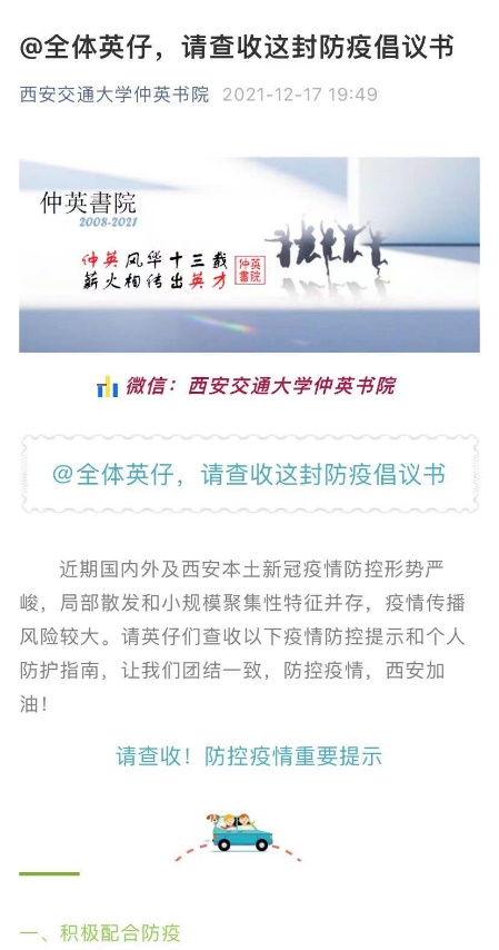 临近岁末,一场突如其来的疫情打乱了全体师生的正常生活,众志成城、共克时艰,仲英书院严格按照陕西省和学校出台的疫情防控要求,用贴心、细心、暖心的工作,全力抗击疫情。