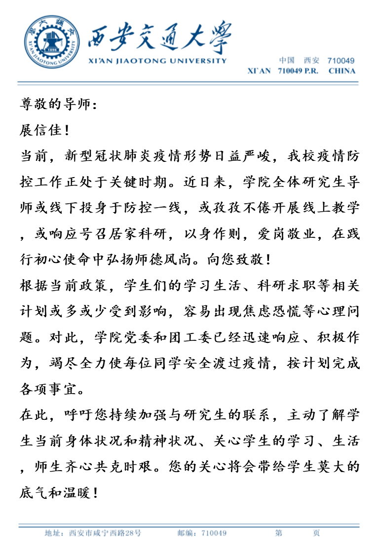 “亲爱的导师,展信佳……在此,我们呼吁您持续加强与研究生的联系,主动了解学生当前身体和精神状况、关心大家的学习、生活,师生齐心共克时艰。您的关心将会带给同学们莫大的底气和温暖!” 这是化工学院所有研究生导师在疫情防控期间收到的学院党委的来信。