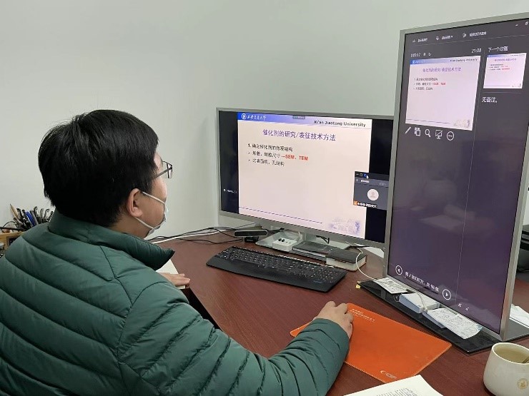 24日下午3:00,弘润楼19—4192办公室里,杨卷副教授正全神贯注盯着屏幕,通过线上课堂的方式讲授《催化剂研究方法》课程。采取线上授课,并没有降低杨老师的授课热情和质量,依旧和屏幕那一端的同学们充分讨论,热火朝天。以杨卷老师为代表,化工学院一大批老师在创新港坚守指导学生开展科研工作。