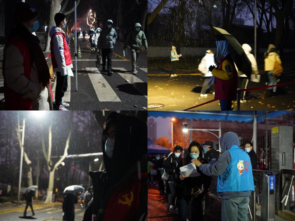针对全市疫情防控特殊时期考试要求,学工系统联合大学生党委,向各党支部和广大党员同志发布《关于在疫情防控中发挥党员先锋模范作用的倡议书》,组织动员青年教师、学生党员冲锋在考研保障工作第一线。倡议一经发出,一时间各书院微信群中消息不断,报名人数骤增。“我是党员,可以加我一个吗?”“我也是党员,我报名!”“我正在入党,我也要争先”……无数青年党员、团员们主动发声,积极加入研究生入学考试“党员志愿先锋队”,奔赴一线。“令我印象深刻的是,在招募志愿者时,大家报名都非常积极,需要大家在寒冷的清晨5:40就到岗,在风雪中站上3个小时,但是没有人畏难,大家积极报名,每一次都超额完成指标。有的同学因报名晚了没机会参加志愿活动,更是私下找到负责人,请求‘走后门’加入志愿者团队。”励志书院志愿者赵喾如是说。