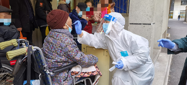 17日晚通知下达后,很多科主任、党支部书记、护士长、党团员、技术骨干和普通医护主动返院驻守,管理部门很多员工来院当志愿者;医疗区值班医护主动承担起病房患者和家属的采样工作;家属区紧急设起了采样点,人员和用物配备到位;因很多老人已入睡,志愿者就在没有电梯的老楼中一个单元一个单元、一层楼一层楼地爬楼梯叫醒住户下楼采样。直到凌晨4点半最后一名受检者离开,第一轮全员采样完成。
