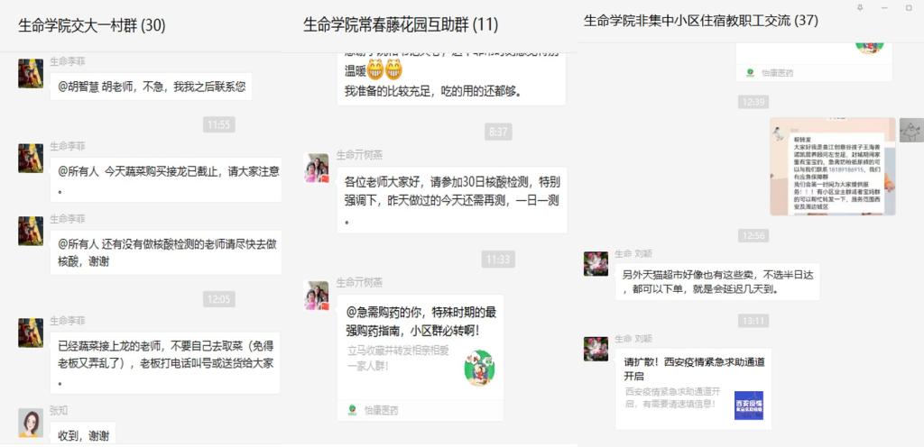 为帮助教职工解决居家期间的各类生活问题,由生命学院党委牵头,学院工会负责,组织建立10个以教职工集中居住社区为主体的互助群,号召教职工携手互助,凝聚最大的力量抗疫。