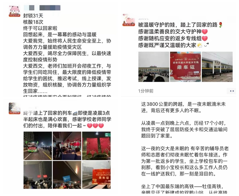 人文学院佘泽奇的“朋友圈”被学子返乡动态占据。他说:“凌晨,卢书记、王校长亲切送别学子,那一刻我打心底里感受到了交大的暖暖关切。我家比较远,回家车次少,买到了距离市区最远的西安南站的票,学校‘点对点’将我们送到车站,保障了大家的安全。为了返乡工作,我知道很多志愿师生都没有休息,我想由衷地说一句:感谢有你,你们辛苦了!”