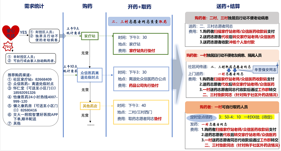 民生是最大的政治,解决好民生问题,疫情防控才能事半功倍。“家里天然气没有了”“水管漏水了”“行动不便老人怎么做核酸”……兴庆家属区疫情防控工作专班开通疫情防控爱心热线,积极协调、反馈、解决各类现实诉求。针对热线中普遍反映的“买药难”的问题,工作专班还建立了采药配药的服务小组,梳理了天然气和药品采购的渠道,制作了相应的流程图。