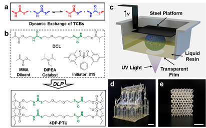 研究人员将2,2′-(1,2-乙二基双氧代)双乙硫醇(EDDET)和甲基丙烯酸异氰基乙酯(IEM)通过点击化学合成动态交联剂(DCL),然后将DCL与活性稀释剂甲基丙烯酸甲酯(MMA)混合得到打印墨水,通过DLP打印得到分辨率高、表面光滑的聚硫氨酯(4DP-PTU)结构。