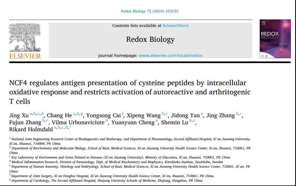 近日,西安交通大学第二附属医院特聘教授RikardHolmdahl团队相关研究成果“NCF4 regulates antigen presentation of cysteine peptides by intracellular oxidative response and restricts activation of autoreactive and arthritogenic T cells”在Redox Biology上发表。该研究论文阐述了NCF4依赖的细胞内ROS可使半胱氨酸肽维持在氧化交联状态,从而限制自身反应性T细胞对半胱氨酸肽的呈递,抑制致关节炎T细胞活化,保护机体罹患自身免疫性关节炎。西安交通大学第二附属医院为文章的第一作者和通讯作者单位。该研究工作得到了中国国家自然科学基金、陕西省重点研发计划、中国留学基金委奖学金等项目的支持。