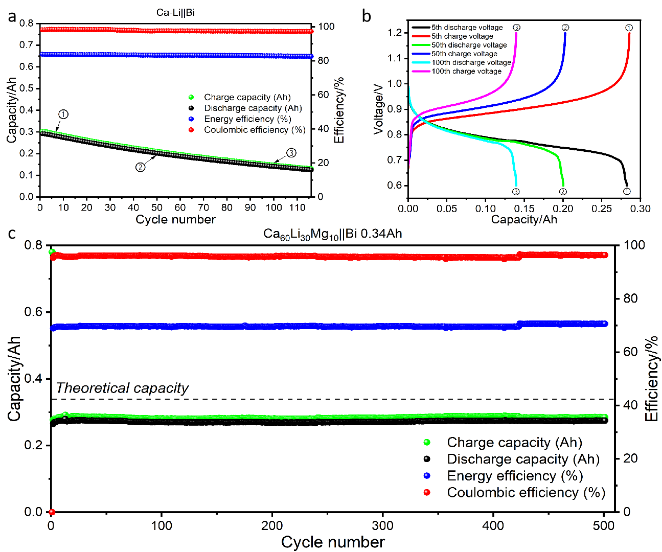 图2 双阳离子电池电化学性能(a)Ca-Li||Bi循环曲线图(b)Ca-Li||Bi充放电曲线(c)Ca-Li-Mg||Bi循环曲线图