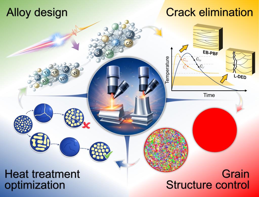 镍基高温合金因其在高温、高应力和复杂服役环境下仍保持优异的力学性能,被广泛应用于航空发动机、燃气轮机和能源装备等关键领域。这类合金通常依靠精密的化学成分设计和严格调控的显微组织结构来获得良好的高温强度、抗蠕变和抗疲劳性能。然而,传统高温合金构件主要通过铸造与机械加工等“等材”或“减材”方式获得,存在制造工序繁琐、生产周期长、产品合格率低等问题,且长期服役时难免受高温冲蚀、热交变载荷等因素影响产生损伤、导致失效。近年来,金属增材制造技术(即3D打印)的快速发展为高温合金复杂构件的制造及修复提供了全新的技术路径。通过逐层选区熔化、堆积成形,增材制造在工艺灵活性、材料利用率以及加工效率等方面展现出明显优势。然而,这一技术在实际应用中仍面临诸多挑战,例如打印过程中易产生热裂纹、晶粒组织难以精确调控,以及打印态组织对材料性能的影响机制尚不明确等问题。尤其对于高裂纹敏感性高温合金,如何在抑制冶金缺陷的同时,实现组织与性能的协同优化,是制约该领域发展的关键桎梏。