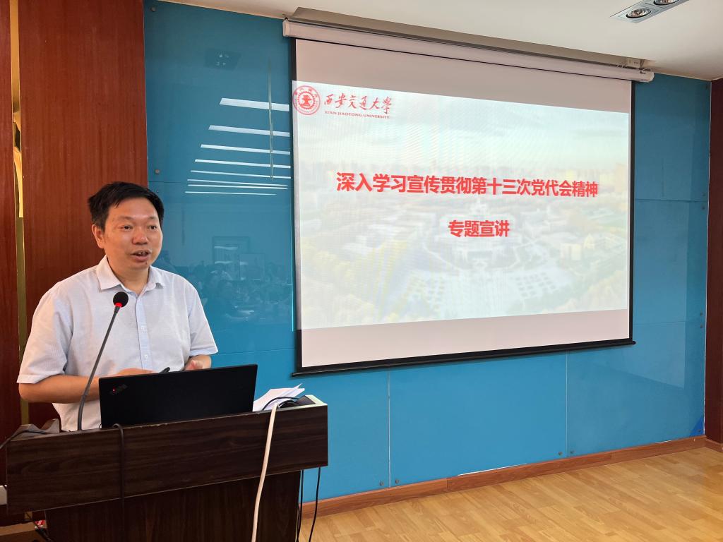 严俊杰带领大家深入学习了习近平总书记关于教育、科技、人才的重要论述以及陕西省第十四次党代会的基本情况,从深刻认识学校第十二次党代会以来的工作成效、深刻认识今后五年的奋斗目标和总体要求、深刻认识今后五年的主要任务三个方面,对学校第十三次党代会报告进行了深入解读。他强调,学校第十三次党代会是在我国进入全面建设社会主义现代化国家、向第二个百年奋斗目标进军新征程、学校加速推进“双一流”建设的关键时期,召开的一次十分重要的会议。要深刻认识这次党代会的重要意义,准确把握精神实质,学深学透做好大会精神的宣贯工作,明确任务书、路线图、时间表、责任人,切实将其转化为砥砺奋进的实际行动;要坚持问题导向和目标导向,深刻理解和认识“为谁培养人、培养什么人、怎样培养人”这个根本问题,立足学院实际,找到推进学院高质量发展的具体路径。
