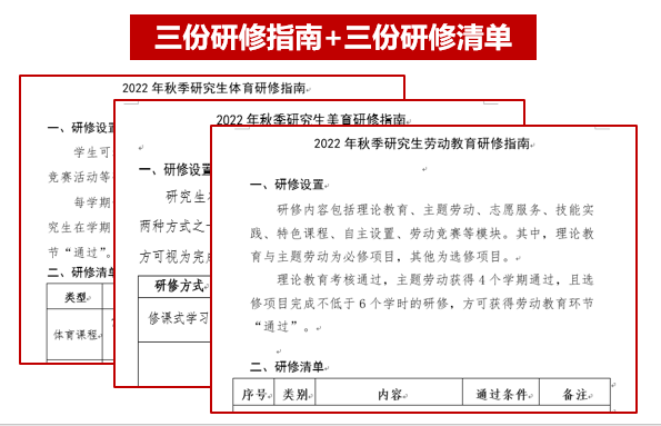 具体而言,体育研修以“养成锻炼习惯、提升身体素质、塑造健全人格”为目标;美育研修以“提高审美能力、提升人文素养、追求科学的艺术性、提升人格魅力”为目标,使得研究生能够主动追求“心灵美、语言美、行为美、仪表美”;劳动教育研修以“熟悉基层劳动、尊重一线劳动人员、养成热爱劳动品格和高尚的职业素养”为目标。